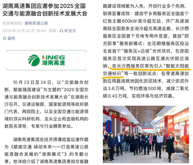 金旭科技“智能蓄能自發光反光太陽能交通標識”系列產品在湖南高速集團長沙西服務區率先試點應用。